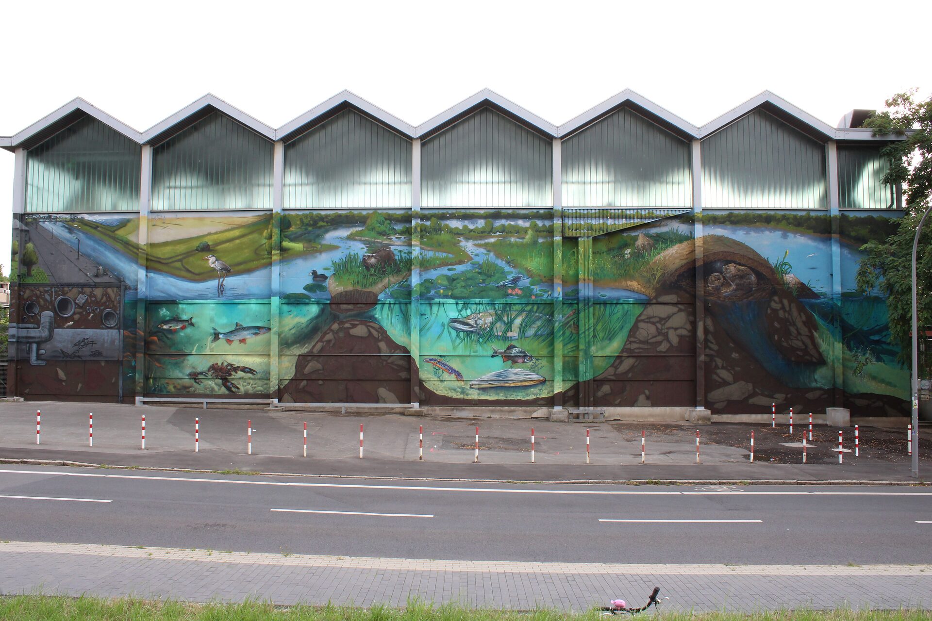 Doch wir ließen uns nicht entmutigen und bald war ein alternativer Plan gefasst: Ein großes Wandgemälde zur Biodiversität rund ums Gewässer sollte es werden. Wir wollten das Thema Biodiversität in die Stadt bringen. Es ging darum, Aufmerksamkeit für das Thema zu generieren. Aber auf eine positive Art! Auf gar keinen Fall wollten wir mit dem Finger auf jemanden zeigen, sondern dazu einladen, sich mit den städtischen Gewässern und ihrem Wert für Mensch und Natur auseinanderzusetzen.